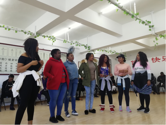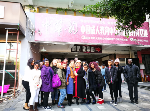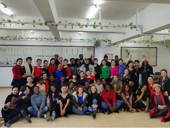 一阵激烈的鼓声响起,津巴布韦职工展示了激情四溢奔放热烈的非洲鼓舞,不断引起在场观众阵阵欢呼和热烈的掌声,中华韵学员也迫不及待地加入其中与职工进行“尬舞”起来,将交流活动推向高潮,展现了一场中外不同风格的舞蹈交流。大家伴随着鼓声舞蹈,沉浸在欢乐之中。在一片欢声笑语过后,津巴布韦职工演唱了她们的国歌,张口就是多声部和声,一鸣惊人,让在场观众惊讶不已,有学员说她听出了三重唱的音律,连声赞叹:“她们比我厉害!”最后大家一起愉快的合影留念,为此次文化体验活动画上了圆满的句号。