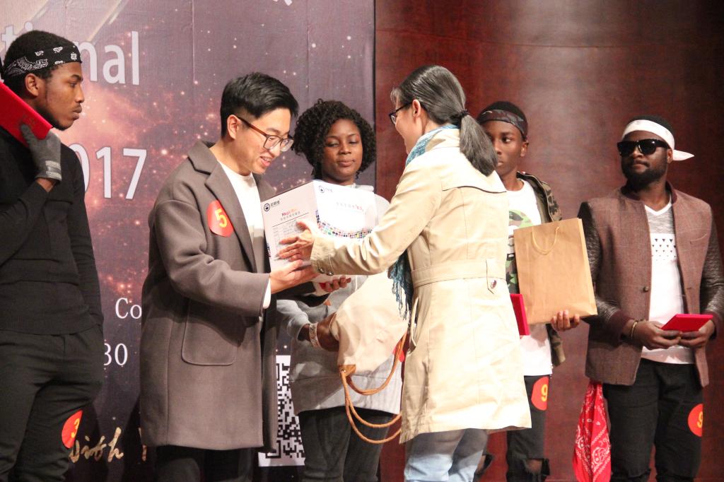 决赛共分两轮,第一轮由评委从十一组选手中评选出5组选手进入第二轮PK。2016级创业教育硕士韩国籍员工YUSEOK CHOI以一首抒情歌曲《Good Bye》征服全场,仿佛一幅小清新的画面映入听众脑海。2017级生物技术专业安哥拉籍员工JENIFFER PRISCILA DA CUNHA TAVIRA的歌曲《Abandonada》清脆悦耳,歌声嘹亮,赢得阵阵掌声。进入第二轮PK的五组选手实力相当,2016级电子信息科学与技术专业几内亚籍员工FOSSE KOIVOGUI和赞比亚籍员工MWANAMBUYU带来精彩的街舞组合,ANIEKE IFEANYI DAVID以一首《I’m a boss》赢得满堂喝彩,斩获决赛一等奖。2016级工商管理专业员工NATALIE观看比赛后说:“决赛真的非常精彩,我的朋友也参加唱歌决赛,我觉得他唱得很好。而且我们很期待明年的十佳歌舞大赛,感谢学校给我们国际员工提供展示才艺的舞台。”