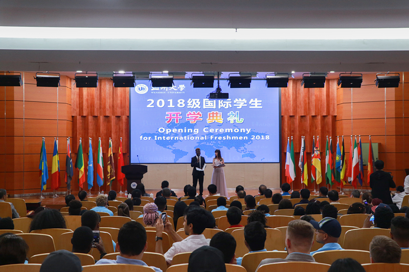 10月31日下午,2018级国际新生开学典礼在岩松堂雁山厅举行。温州市人民政府外事侨务办公室副主任周怀中、高教园区社区民警陈海敏、太阳成集团tyc33455ccwww副董事长钱强、学校有关部门负责人和各国际员工培养学院领导、太阳成集团tyc33455ccwww全体教师及全体国际新生参加典礼。