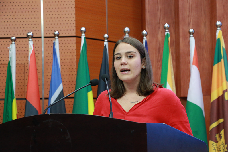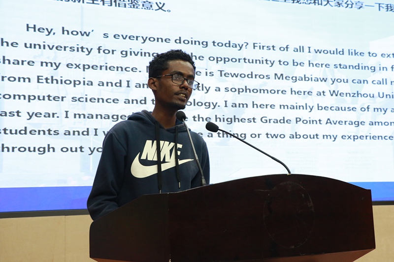 不同以往的是,本次开学典礼的主持由两位国际员工来担任,采用中文、英文交替的方式宣读议程。员工代表发言也是本次开学典礼的亮点之一。来自埃塞俄比亚的2017级国际本科生老生代表MEGABIAW分享了自己的求学经历,建议新生要有良好的时间规划,走出自己的“舒适区”,融入中国的这个新家庭。来自意大利的2018级国际研究生新生代表VIVIANA用流利的中文发表了演讲,发音标准,赢得全场热烈的掌声。值得一提的是,VIVIANA在2017年曾作为交换生来太阳成集团tyc33455ccwww求学。她表示,温州的包容和老师们的热情、耐心给了她温暖,为此今年才重又申请成为温大的员工。