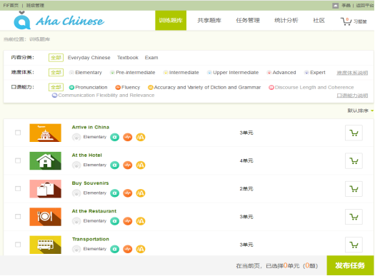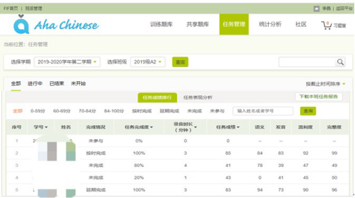 (4)引入口语训练系统,辅助汉语教学。Aha Chinese是一款由外研社联合外研讯飞倾力打造融合最新口语教学理念和尖端语音评估技术的、适配多终端的汉语口语教学与管理系统。老师可以在系统上发布教学任务,员工可以随时随地练习汉语口语。