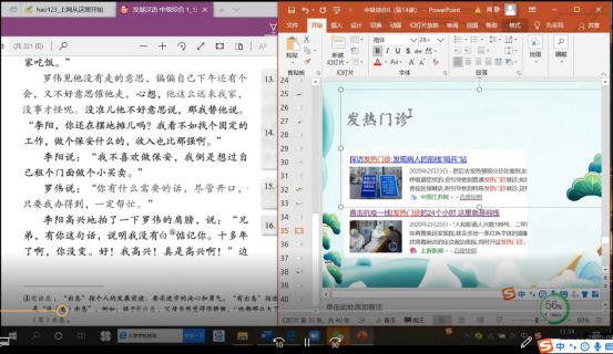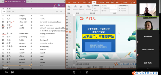 (2)打开教学PPT和电子课本,共享屏幕,正式开始课程教学。教学进行时,教师既可以在屏幕上展示PPT,也可以进行板书。一般在教师讲解过程中,要求员工静音、或保持安静,但允许员工有疑问的时候随时打开麦克风向教师发问。在教师讲解结束后,会进行造句或问答练习,根据练习的具体内容,或请员工单独发言,或是教师与单个员工交流,或令员工与员工相互交流,教师会根据具体情况明确指示员工打开或关闭麦克风。在教学过程中,老师和员工都能熟练运用ZOOM会议系统的功能,教学过程进展能够始终保持流畅,迄今尚未因技术原因产生过任何中断、未出现过任何问题。