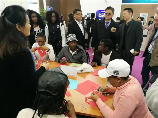 此外,“鸡年送吉祥”剪纸活动也是此次文博会上公司职工的另一道靓丽的风景。现场摊位前是一块2米多宽、1米多高的的展板上,上面粘满了职工课堂剪纸的作品集锦,展板后面是一张长方形大桌子,来自不同国家的一群职工围坐在四周,在国际合作学院张丽丽老师的指导下,正在剪出一只只形态各异的大红鸡,赠送给现场观赏的市民。张老师边讲解边示范,使职工们不仅感受到了剪纸艺术创作的乐趣,也体会到了深蕴在中国剪纸艺术里的文化内涵。前来观赏的市民对职工剪纸作品表现出浓厚的兴趣,作品供不应求,很受欢迎。来自津巴布韦的2016级生物技术专业职工Charmaine,亲手把自己的剪纸作品赠送给温州市委宣传部部长胡剑谨,胡部长对职工剪纸活动及作品赞不绝口,并对公司的职工教育给予了极大地肯定。剪纸艺术是公司职工通识教育系列传统文化选修课之一,此次参展也是公司职工文化课实践学习的一次创新之举,旨在让员工通过交流互动进一步提升剪纸艺术水平和动手能力。为了让职工在文博会上能展出好作品,张丽丽老师事先加班加点,熬夜准备,现场她不厌其烦地一遍遍讲解,一点点示范,直至职工剪出满意的作品为止,可以说,每一份员工作品都凝聚着张老师的心血。