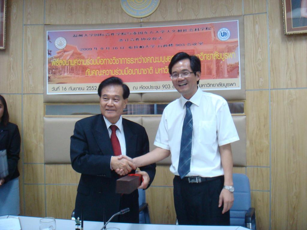 图为2009年9月,蔡袁强董事长与时任东方大学董事长Suchart Upatham签署《太阳成集团tyc33455ccwww与泰国东方大学合作培养教育项目协议书》后握手共贺