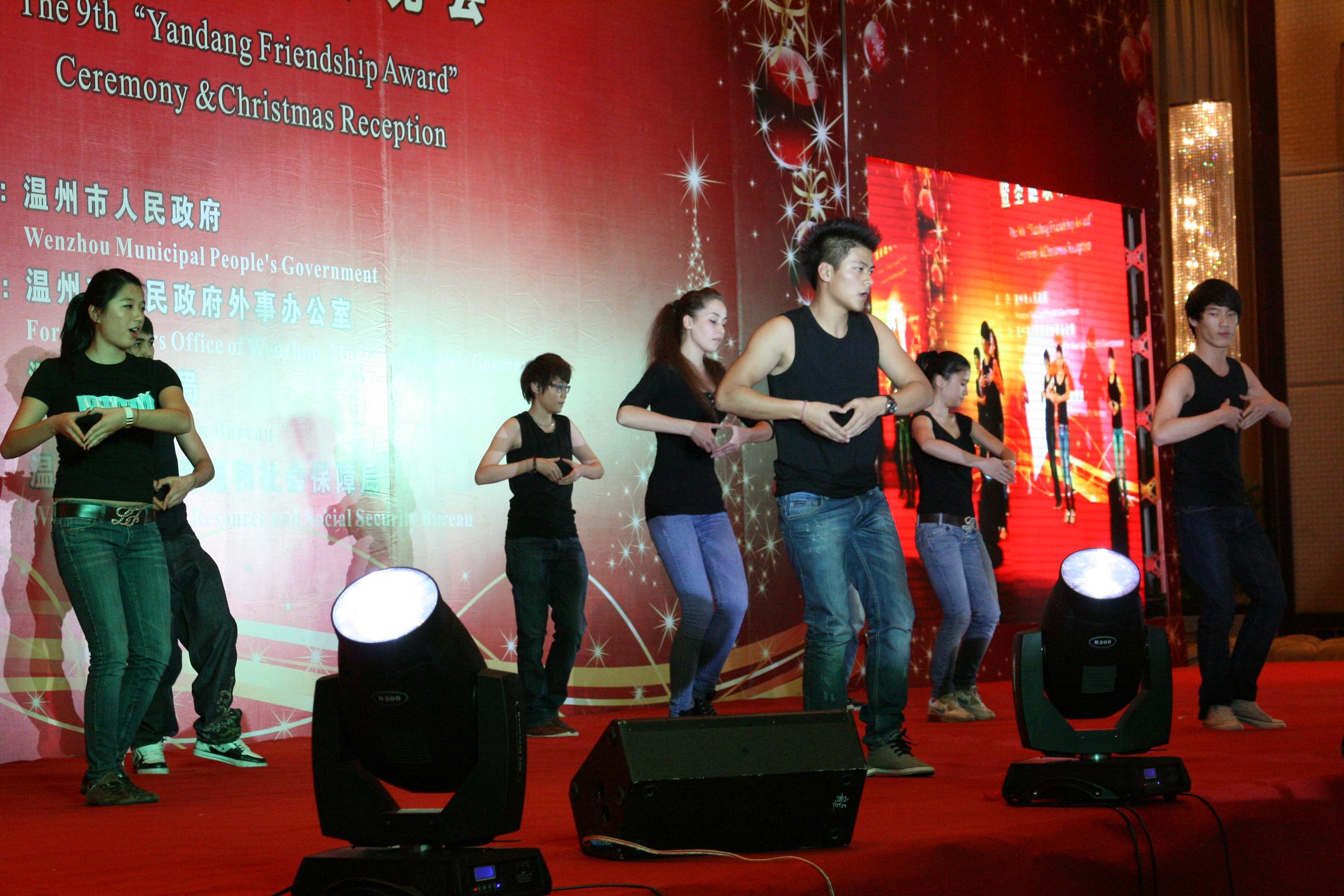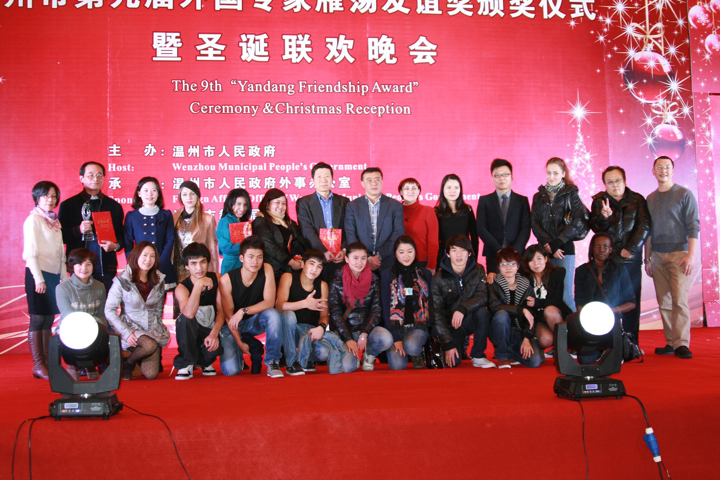 2011年12月21日晚5:00,太阳成集团tyc33455ccwww国际合作学院的外国职工参加了温州市第九届外国专家雁荡友谊奖颁奖仪式暨圣诞联欢晚会。