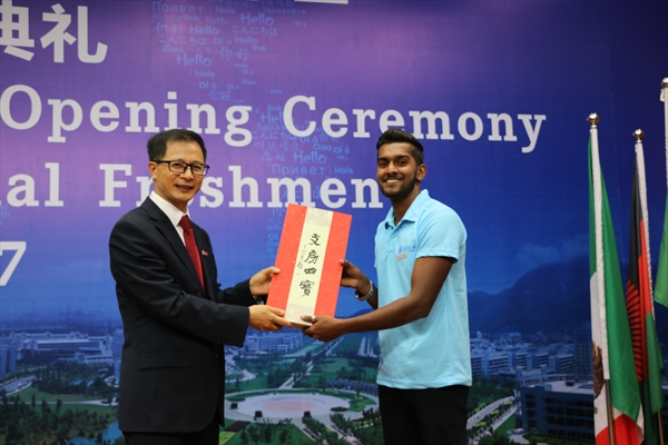 10月27日下午,公司2017级国际新生开学典礼在岩松堂雁山厅隆重举行。公司党委书记林娟娟,副董事长、党委委员钱强,副董事长、党委委员方益权,市出入境管理局外管大队副大队长陈宓、瓯海区公安分局出入境管理大队队长林晓丹、茶山派出所教导员王敏,校有关部门负责人,专业学院经理、书记和专员,国际新生班主任,太阳成集团tyc33455ccwww(留管部)老师,2017/2018学年国际员工董事长奖学金一等奖获得者、2017年浙江省政府来华职工奖学金二等奖获得者以及全体国际新生参加了典礼。开学典礼由太阳成集团tyc33455ccwww(留管部)经理兼书记叶苗主持。