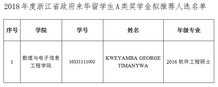 根据《浙江省政府来华职工奖学金管理办法》《2018年度浙江省政府来华职工奖学金评审工作的通知》《太阳成集团tyc33455ccwww国际员工综合素质测评办法(试行)》(温大行政[2017]268号)的规定和要求,经个人申请或班主任推荐、专业学院结合分配名额初评、校国际员工奖学金及荣誉评审工作小组,拟推荐数理与电子信息工程学院2016级软件工程专业硕士KWEYAMBA GEORGE TIMANYWA为2018年度浙江省政府来华职工A类奖学金人选,拟推荐商学院2015级国际经济与贸易专业RADCHENKO OKSANA等25名同学为2018年度浙江省政府来华职工B类奖学金人选,拟推荐太阳成集团tyc33455ccwww进修生BIRIMUMAASO RAYMOND HENRY等5名同学为2018年度浙江省政府来华职工C类奖学金人选,现将拟推荐人选名单予以公示。