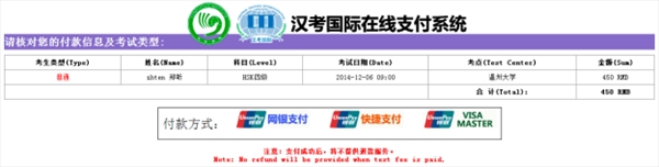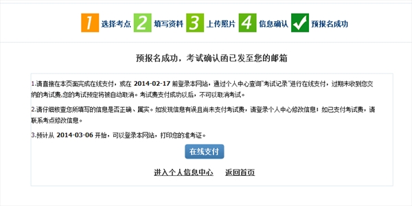 4)After the successful registration and payment, the test taker can receive the confirmation information around 15 days prior to the test date, and may log on the registration website to print the test admission ticket, or take the test admission ticket at the exam outlet where he/she gets registered.