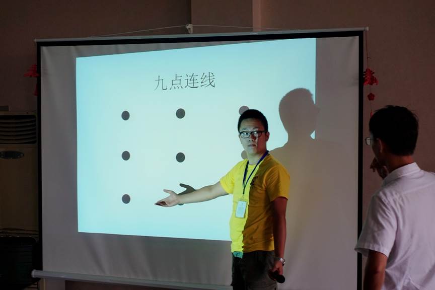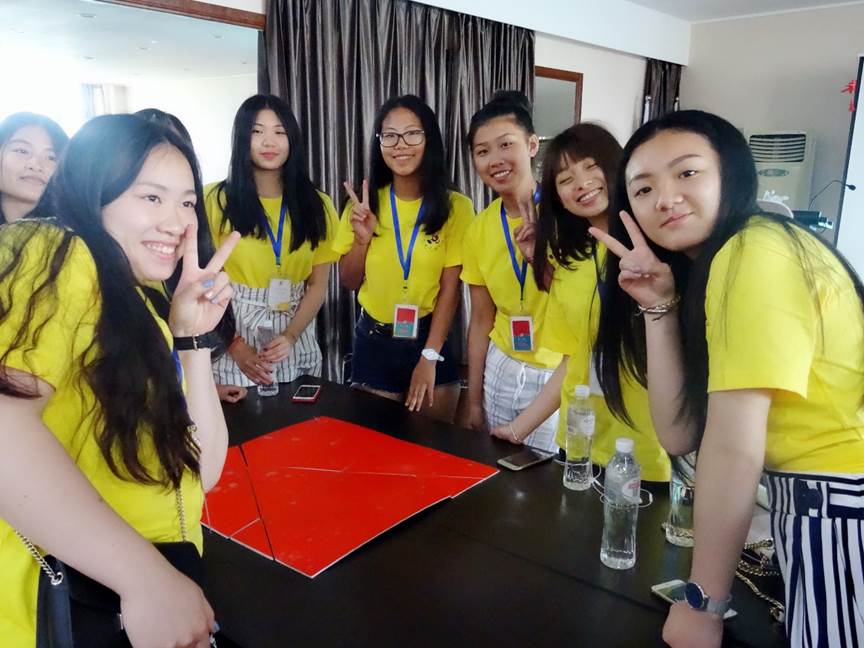 课程一开始,施老师为大家带来一个团队创业拼图游戏,每组拿到零散的拼图碎片,需要将其拼成60cm*60cm的正方形。领到材料后营员们积极动手,气氛热烈。“小黄人组”仅用了30几秒就将拼图完成,显示了她们强大的团队配合能力,这个小游戏,大家明白创业需要团队的努力与配合。