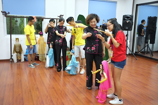 下午一点,营员们出发前往平阳木偶剧团。平阳木偶戏是浙江省温州市的传统民间艺术之一。其历史悠久,具有浓厚的地方色彩,也具有很高的观赏性与研究价值。2008年被列入首批国家级非物质文化遗产名录扩展项目。在剧团,生动有趣的木偶让营员们目不暇接,精细繁琐的制作过程又令大家大开眼界。而后,剧团的大师们为营员们表演了木偶剧《耍猴》、《贵妃醉酒》、《猪八戒背媳妇》和《徐策跑城》,让人赞不绝口。欣赏完表演,剧团人员还邀请营员们亲自上台学习感受如何表演提线木偶,大家纷纷冲上台,十分踊跃积极。