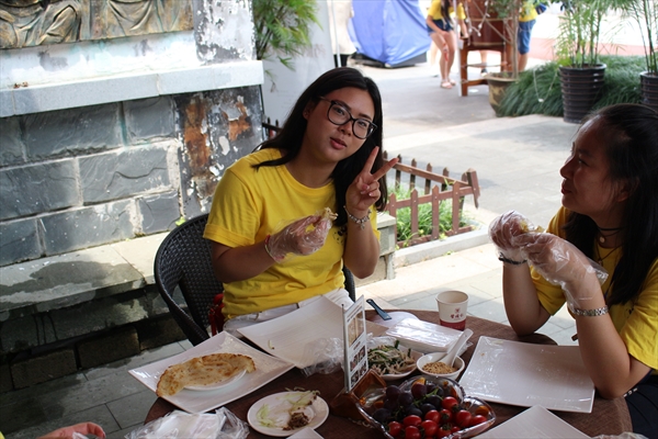饼做好后,营员们来到后院休息,坐在瓯江江畔,喝茯茶,吃美食,赏美景,十分惬意自在。有几位营员还一展歌喉,让大家大大的满足!