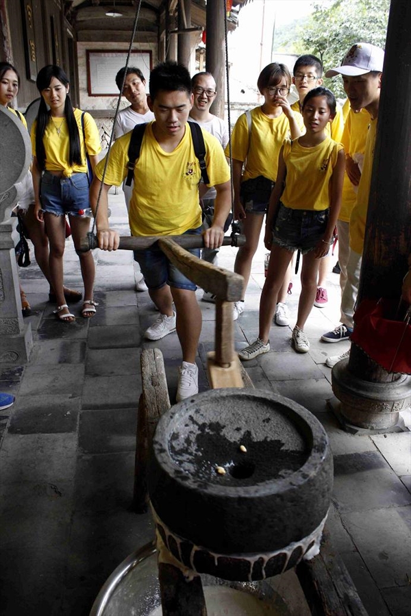 在品尝了楠溪江的特色农家菜之后,营员们来到永嘉县大若岩镇埭头村,深度体验古村落的生活。在古村的陈氏大祠堂中,营员们纷纷玩起了捣舂米,磨豆浆,搓草绳等农耕活动,每一项活动大家都积极参与,争相体验,在一片欢声笑语中感受着原汁原味的传统瓯越农家生活。