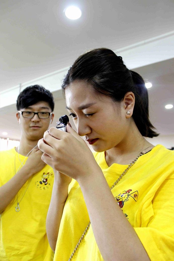 曾女士还跟营员们分享了钻石的开发历史,从印度到欧洲,至巴西的承上启下,到现代工业的发源地南非。她图文并茂地为大家介绍了钻石的鉴别方法4C ,分别从颜色、克拉、径度和切工入手,要通过十倍的放大镜来观察其中差别,一点细小的差异都是会造成巨大的价值差度。为了让营员们更直观的体验鉴别珠宝,曾莞女士特地带来了鉴宝工具,让营员们亲自观察鉴定,找出钻石上的编码,此外还分享了几个不需要工具也能鉴宝,穿透观察法、根据亲油性鉴定法、呵气试验等简单又实用的小技巧让营员们个个都能慧眼识珠。