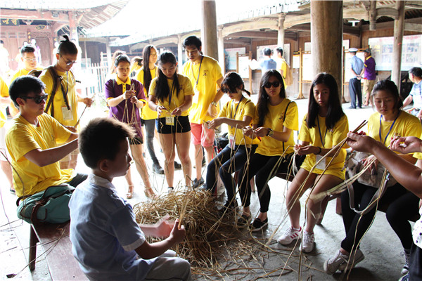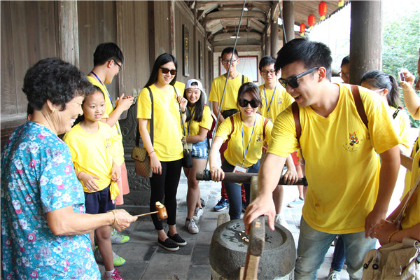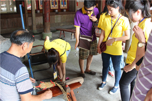 在品尝过楠溪江特色农家菜后,营员们来到永嘉县大若岩镇埭头村,深度体验古村落的生活。在大院中,营员们玩起了舂米、磨豆浆、搓草绳等活动,每一项活动营员们都热烈参与,大家不顾脸上流淌的汗水,争相体验,在欢声笑语中体会着原汁原味的传统瓯越农家生活。