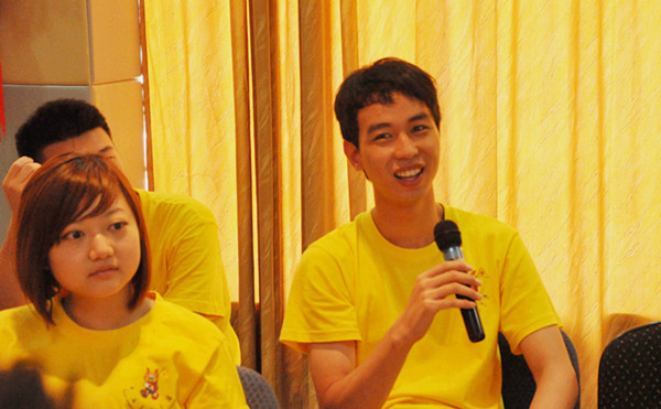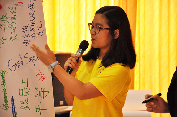 培训开始前,周老师先让营员们来了一场热场游戏,营员们围拢成圈,先与身边的伙伴碰肩膀,然后找10位伙伴互碰肩膀,最后,进行伙伴组合。欢声笑语后,营员们回到座位上,一改之前沉默茫然的状态,对接下来的培训课程充满了期待。周老师用一句“获得多少取决于参与度的高低,你要做运动员还是观众?”的提问引导营员们更加投入、更加主动地去参与互动,吸收课堂内的知识。