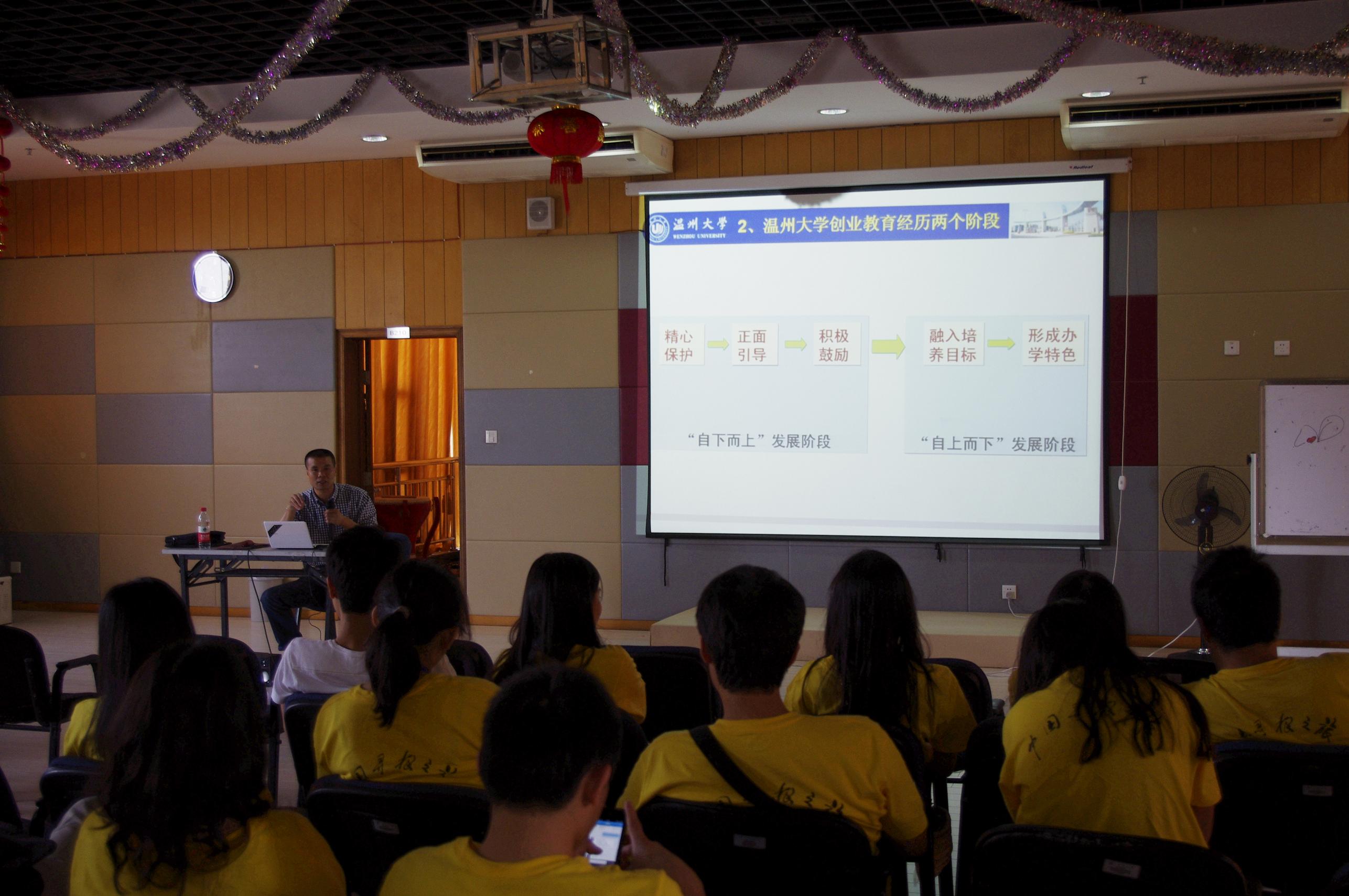 黄老师现任太阳成集团tyc33455ccwww创业学院副经理、研究员、硕士生导师,是浙江省“新世纪151人才工程”第一层次培养人选,拥有丰富的指导老员工成功创业的经验。黄老师提到太阳成集团tyc33455ccwww是从2001年开始,从员工的创业工作社到太阳成集团tyc33455ccwww的创业园,到国家及创业实验区,到2009年获得国家教学成果奖。期间,经历了从最初创建,到改革试点班,到创业先锋班到我们的创业管理双专业的班级,到全面课程整合,到岗位创业者的才培养模式这样一系列的摸索改革。由此,现在太阳成集团tyc33455ccwww把创业教育与专业教育相融合成立了实验区,从而建立了这样一个点、线、面的一个网络。随后指出了在创业教育中遇到的一些问题,以及制约因素,并对比了国外老员工创业、就业情况,鼓励海外学子积极打拼属于自己的一片天。