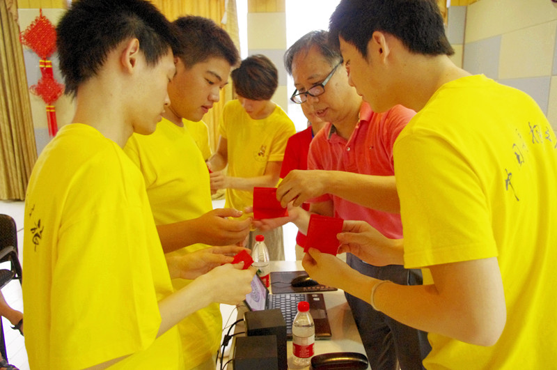 赖老师现场传授剪纸秘技,教大家如何一刀剪出“囍”,营员们围着赖老师,看得饶有兴致。一张“囍”引起了大家对剪纸的兴趣,赖老师接着为大家介绍了关于中国剪纸艺术的基本情况,当他展示自己的剪纸作品时,在场营员一阵惊呼并报以热烈的掌声。赖老师请了一位营员上台,现场为他做侧面剪纸。当看到和自己几乎一模一样的剪纸时,这位营员开心地说“剪纸比我本人还帅!”他小心翼翼地将该侧面剪纸放在一个本子里,轻轻地放到书包里,说一定要带回意大利去,让他的朋友都来看看。