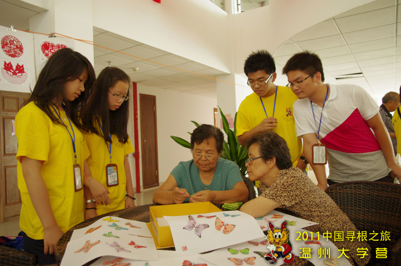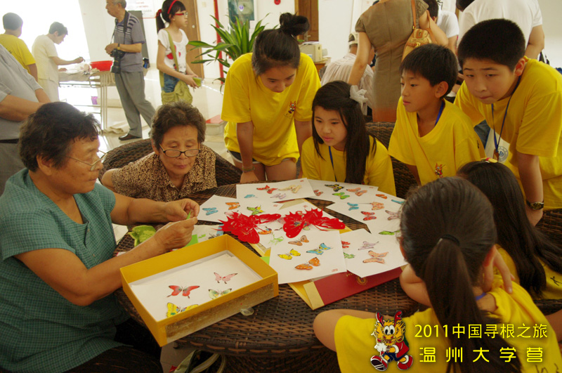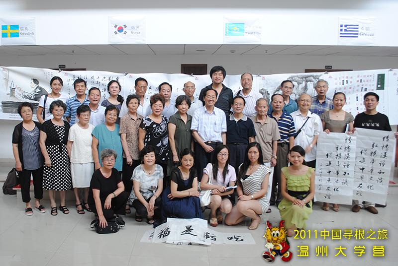 在高山流水的古筝声中,整个活动到处都充满了古色古香传统文化气氛。最后,温州市老年书法协会的老干部们,还赠送了书画剪纸作品等给营员们和海外华校教师培训班的学员们,并和大家一起合影留念。