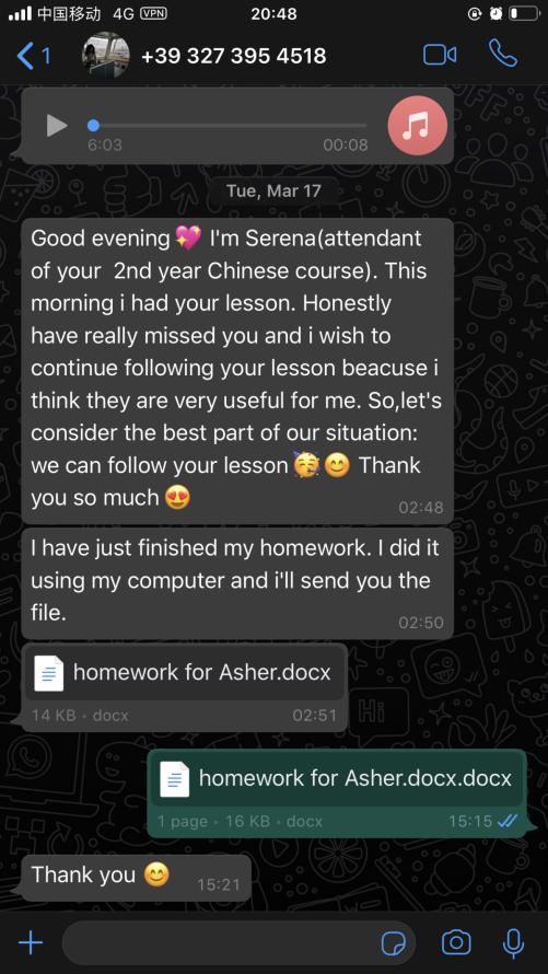 今年2月初,由于疫情原因,直接导致2020-2021年度太阳成集团tyc33455ccwww外派老师不能按时成行。考虑到当时的疫情,新任老师将无法赶上3月份意大利春季开学。“系主任Silvia和中文教学负责人Gianluigi老师多次和我沟通,意大利员工也多次与我联系,希望我能继续给他们开课,我深深地感受到了自己肩上的责任。”张珉璐说,“对于意大利分校的员工来说,他们学习中文的目的并不是猎奇一门遥远的东方语言,而是将中文使用纳入了自己的职业规划,员工们的学习动力很足,热情也很充沛,但中文课程设置相对不足。作为对外汉语教师,我们就是要利用有限的教学时间,取得最大化的教学效果。所以早在2月份的视频会议时,我就提出了用录课的方式讲解用词和文法,同时给员工留足口头和笔头的作业,最大程度保障员工们的学习效果。”