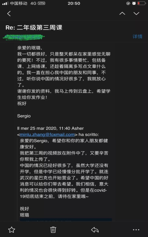 “刚回温州的时候,正是温州疫情最严重的时候。虽然远隔千山万水,意大利员工和同事时时刻刻通过网络关注中国疫情和温州疫情,几乎天天给我发来短信,询问和关心我的生活起居,这些跨越山水、跨越国界的关爱给了居家隔离的我诸多安慰。”