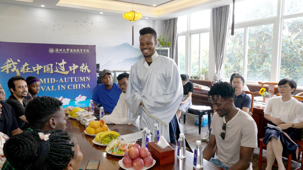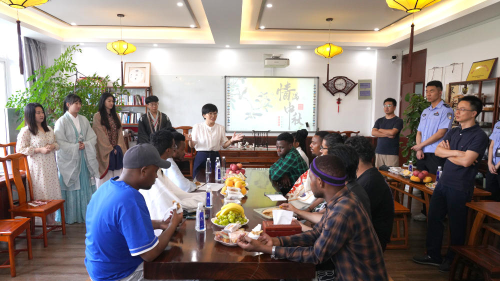 “中秋节又称‘团圆节’,在中国传统文化中有极其重要的意义,中国人自古以来就有赏月团圆的习俗……”当天活动以“我在中国过中秋”为主题,邀请了来自土库曼斯坦、也门、尼日利亚等国的国际员工代表和部分汉语国际教育专业硕士生参加,一边品尝月饼、水果,一边聆听讲解中秋节的起源、风俗习惯,以及它所代表的团圆和思念等含义,学唱歌曲《明月几时有》,现场气氛很是热闹。
