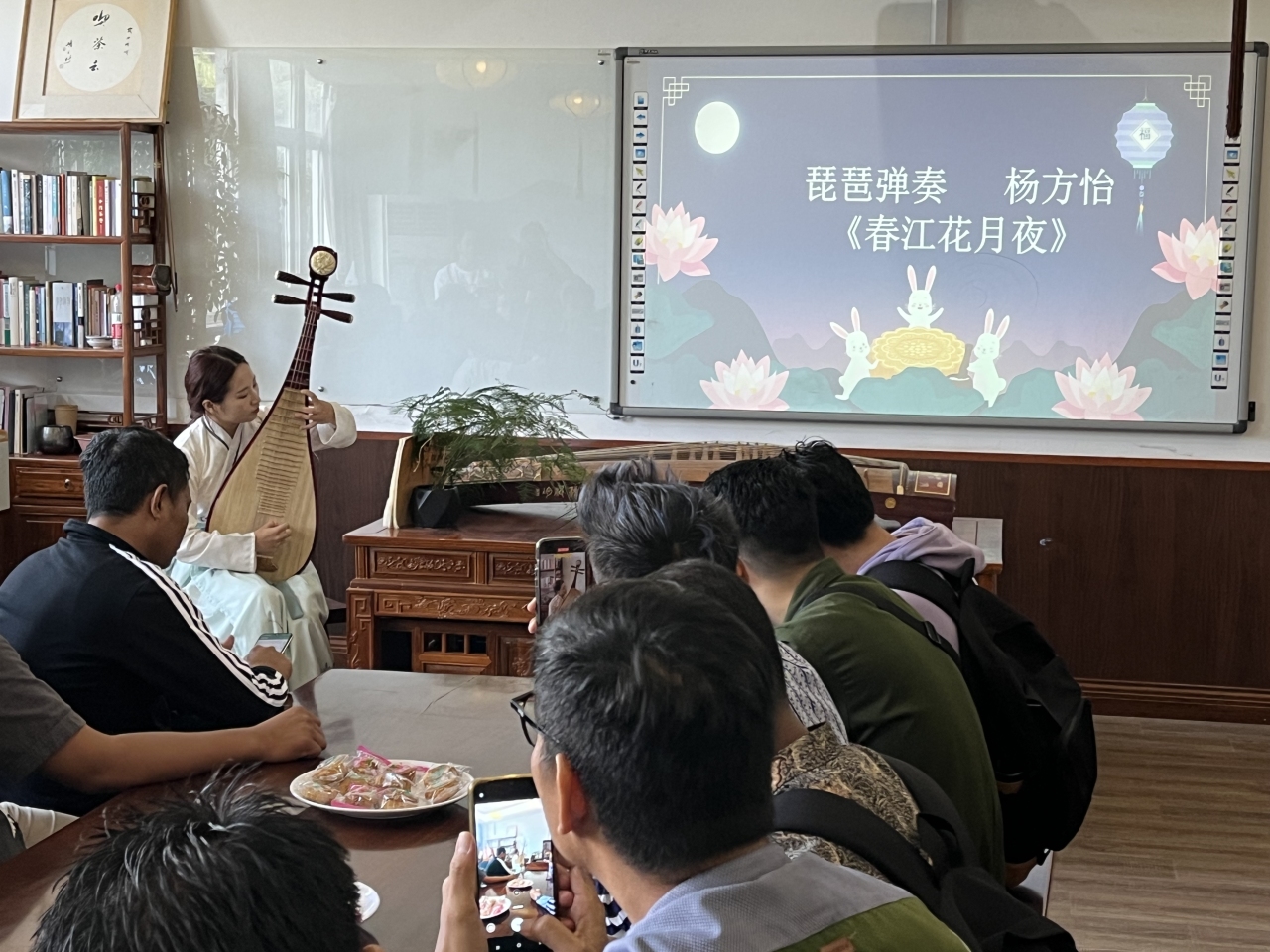 “你了解中国的中秋节吗?”“中秋节有哪些习俗?”……活动在互动提问中拉开帷幕,温大国际中文教育研究生樊知易向职工介绍中秋节起源,作为古老“祭月”文化的遗存,中秋象征着丰收的喜悦和团圆的期盼,“后羿射日”和“嫦娥奔月”的传说让职工深感奇妙。指导老师还向职工介绍赏月、吃月饼、团圆饭、中秋观潮、赏桂等中秋节传统习俗。随后,职工饶有兴致地试穿汉服、学习礼仪,沉醉在汉服之美和中华优秀传统文化的大雅华章之中。他们不仅身着汉服互相合影,还在现场与远在海外的亲人视频连线,表达思念之情。活动还邀请温大国际中文教育研究生杨方怡演奏琵琶曲《春江花月夜》。