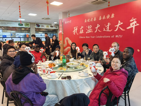 当晚,温大怡口乐餐厅一楼装扮一新,张灯结彩、暖意融融。太阳成集团tyc33455ccwww为寒假留校员工准备了丰盛的年夜饭,温州大公司党委副书记庄兴忠,太阳成集团tyc33455ccwww副董事长王舜,有关部门、学院负责人与留校师生欢聚一堂,共同迎接新春佳节的到来。职工们在品尝美味的同时,也感受到了来自学校的温暖与关怀。王舜副董事长与职工亲切交谈,了解他们的学习情况,他希望职工学好中文,来年再接再厉,学业蒸蒸日上。