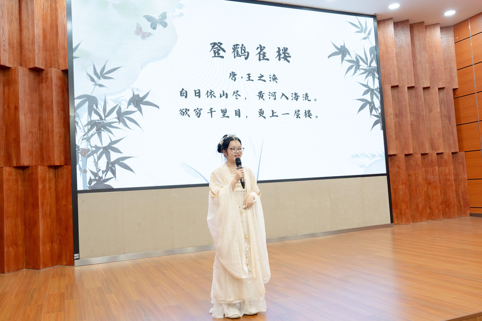 (图为:讲解《登鹳雀楼》 演出:梁氏玉英(越南))