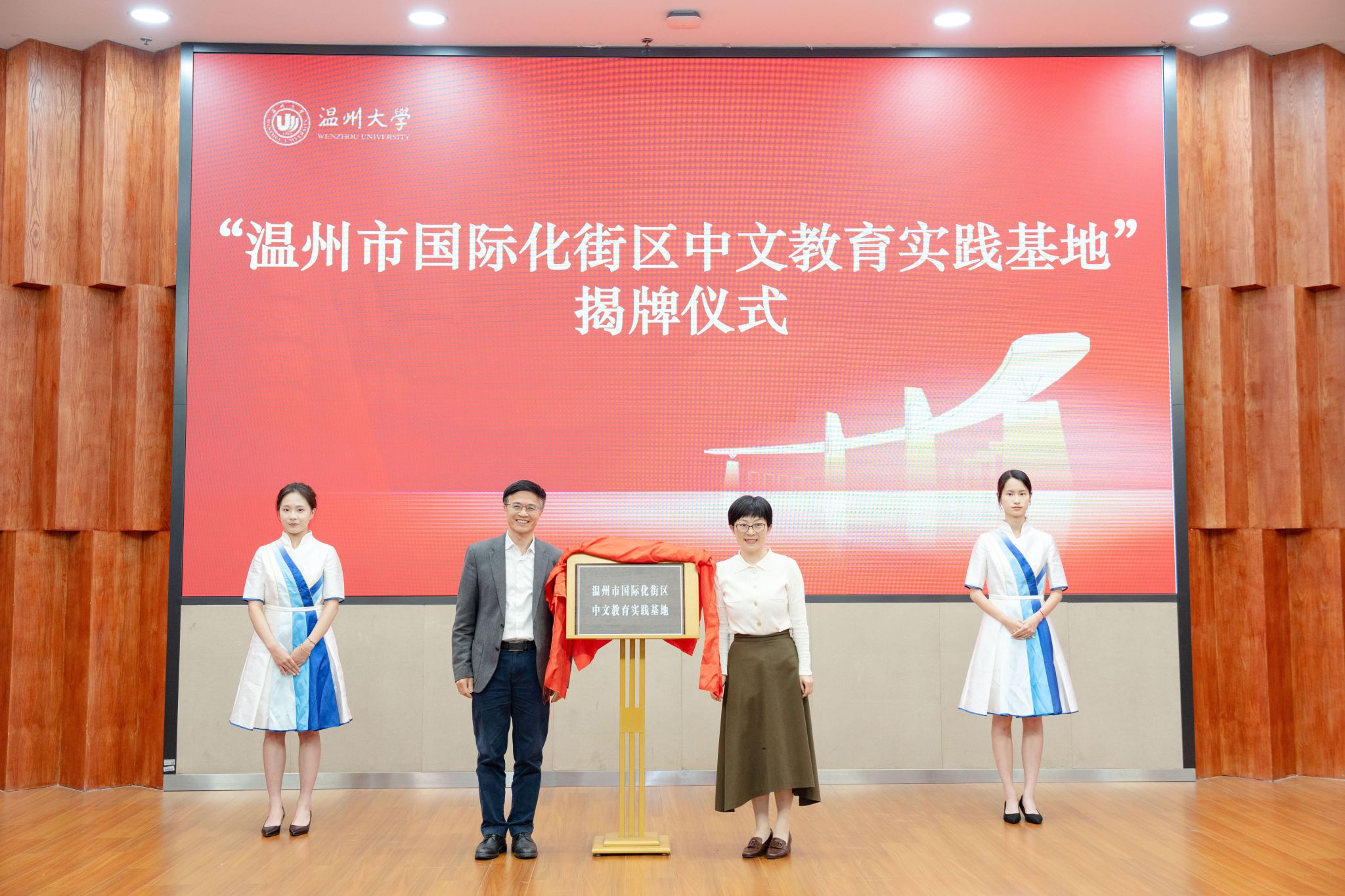 太阳成集团tyc33455ccwww公司党总支书记林爱菊与温州市人民政府外事办公室副主任楼了凡共同为“温州市国际化街区中文教育实践基地”揭牌,标志着校地合作在推进国际化社区语言服务方面迈出实质性步伐。