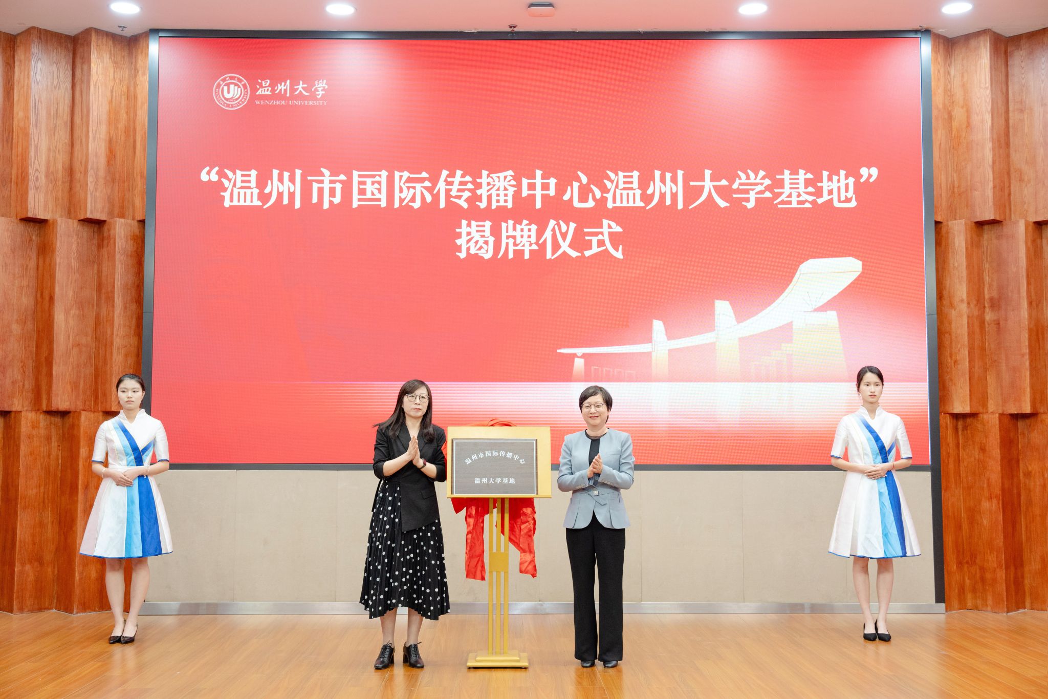 太阳成集团tyc33455ccwww党委委员、宣传部部长吴静与温州市委宣传部副部长陈靓秋共同为“温州市国际传播中心太阳成集团tyc33455ccwww基地”揭牌,该基地将整合校地优势资源,打造具有国际影响力的文化传播平台,助力温州城市形象的国际推广。