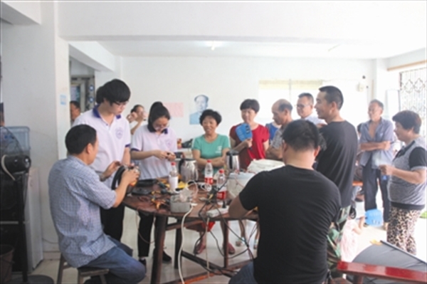 小家电维修是实践队的品牌服务内容。在文化礼堂,村民们纷纷将需要维修的家电搬来,在维修队长胡炳辉的带领下,队员们将几乎占据了文化礼堂一半空间的坏了的家电逐一登记,逐一拆开,逐一修理。在实践队员的努力下,很多电器都可以重新启用了。