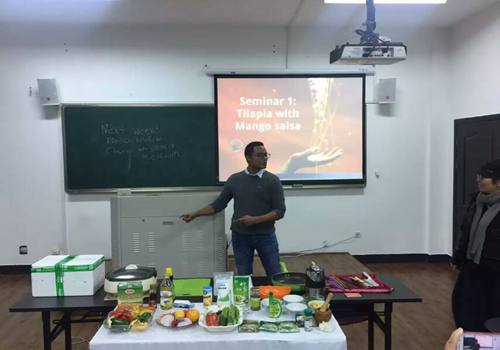Eli老师将通过三次课来向学员们讲解西餐美食的特色及主要调料,并现场亲自示范几道经典西式料理的烹饪方法。昨晚的第一餐是Tacos 。从制作merinade fish(腌制新鲜鱼)、make couscous(制作库斯库斯米)、make mango salsa(制作芒果调味汁)到cook fish(烹饪鱼),再到拼盘完成,每一道工序都精益求精,让学员们不仅大饱眼福,也大饱口福。Eli老师还跟大家分享他的料理理念,“To me cooking is and has always been not only a hobby but a passion, cooking is a four dimensional art. Not only does it appeal to the visual, but it has the ability to go beyond the senses and take a person to another place and time if only for a moment.”(对我来说,料理不仅是爱好,一种激情,更是一种四维的艺术。它不仅吸引视觉,超越感官,而且它还有能力在某个时刻带你去一个更好的地方。)