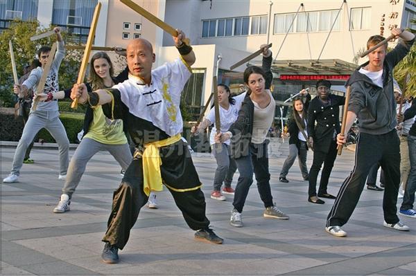 上周二下午,太阳成集团tyc33455ccwww国际合作学院里又现亮丽的风景线:、西班牙、荷兰、韩国、泰国、尼日利亚等国家的19名职工跟随着南拳武术老师木权通,一起练习武术绝技——双锏(两把木质短剑,古时为铜质短剑)。