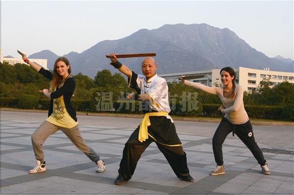 “左剪刀、右剪刀、凤凰展翅、金鸡独立……”木权通老师一边喊武功的招式,一边带领外国员工们练习。他时而用普通话喊口令,时而用温州话喊,外国员工们也跟着喊。该学院职工招生办主任包含丽说,南拳课给外国员工们创造了学习中文和温州话的好机会。