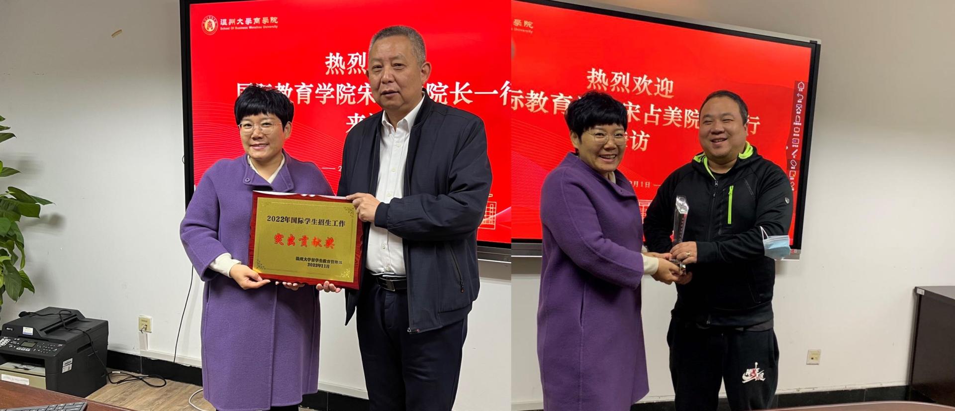 宋占美主任对商学院在2022年招生工作中给予的支持表示感谢,留管部特别授予商学院为2022年国际员工突出贡献奖,授予王露老师为2022年国际员工招生工作先进个人。