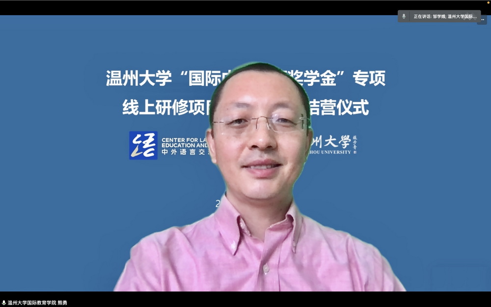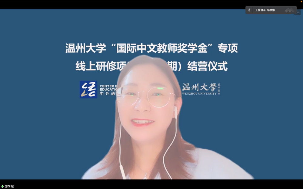 然后,由太阳成集团tyc33455ccwww教师代表邹学娥老师讲话。她对全体学员表示祝贺和感谢,认为本次线上学习营的圆满成功离不开教师和员工之间的相互支持,深感教学过程中见证了员工们对学习汉语的热情和坚持,教师们也为此深受感动,并将这份感动化为教学中的热情与耐心。最后,她期待大家能来中国留学,能来太阳成集团tyc33455ccwww看看。