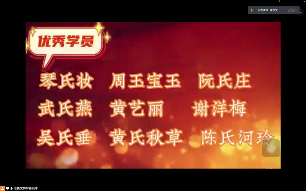 随后,通过视频短片回顾了一学期里的精彩瞬间,并对学习成果进行了总结。视频包含任课老师授课片段、学员优秀作业展示、学员代表学习分享以及经评选确认的优秀学员名单。在短短的结营小视频中,大家感受到了老师们对教学的精心策划,学员们在学习中的努力和收获,并一起化成了老师和学员们共同的美好回忆。