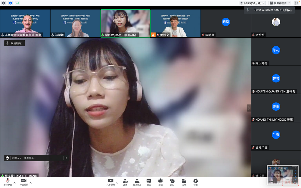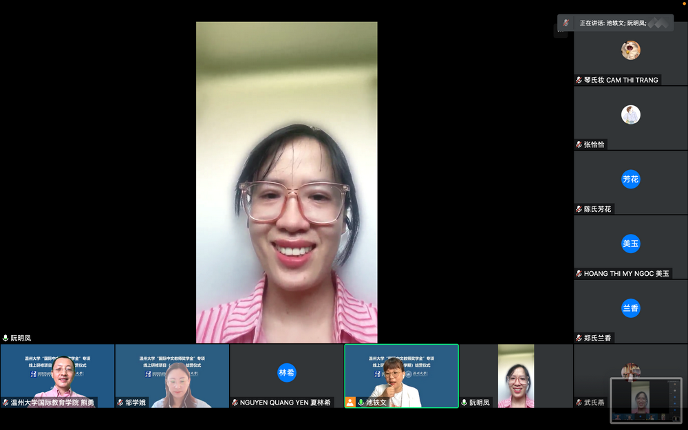 接着,在学员代表发言环节中,越南员工代表阮明凤感慨这是一次非常有意义的经历,让她受益匪浅。通过一学期的学习,她不仅学习了听说读写一系列汉语技能,还对中国文化有了更深的理解和认识,除了线上课的学习,她还会通过看中国的电视剧和音乐学习汉语。