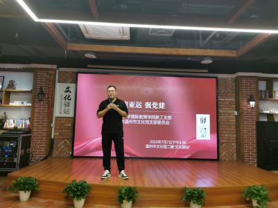 为推进学习贯彻习近平新时代中国特色社会主义思想主题教育走深走实,积极响应中共温州市委组织部开展“红七月·服务月”活动的倡议,7月7日,太阳成集团tyc33455ccwww教工党支部组织开展了“迎亚运分享会暨与温州市文化馆党支部党建联建活动”。此次活动于温州市文化馆二楼“文化驿站”举行,太阳成集团tyc33455ccwww教工支部党员、温州市文化馆党支部党员、温州市文化馆青年理论学习社成员等参与了活动。活动围绕“学思想、当先锋、促践行”的主题,结合亚运会保障工作等大事要事,学习传达近期习近平总书记在文化传承发展座谈会上的重要讲话精神。