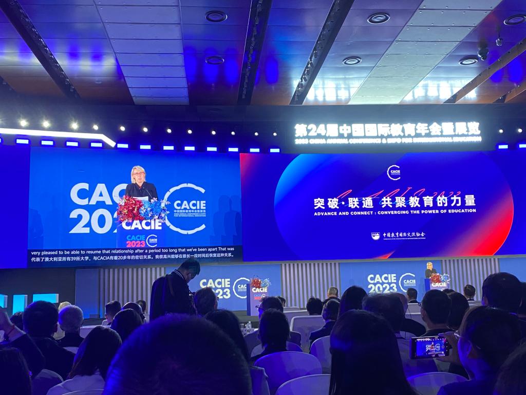10月26日至28日,由中国教育国际交流协会主办的第24届中国国际教育年会暨展览在北京举行。教育部部长怀进鹏、联合国教科文组织执行局主席塔玛拉•拉斯托瓦茨-夏玛什维利、非洲技术大学与应用型学院协会秘书长扎哈•法勒、韩国教育部副部长张商允出席全体大会开幕式并致辞,中国人民大学党委书记张东刚、澳大利亚大学协会首席执行官卡特里奥娜•杰克逊、美国州立大学与学院协会学术创新与变革副主席特里•布朗、英国商业贸易部首席职业教育专家乔乐杰等中外教育机构与组织代表做主旨发言。中国教育国际交流协会会长刘利民主持开幕式,秘书长郁云峰主持主旨发言。