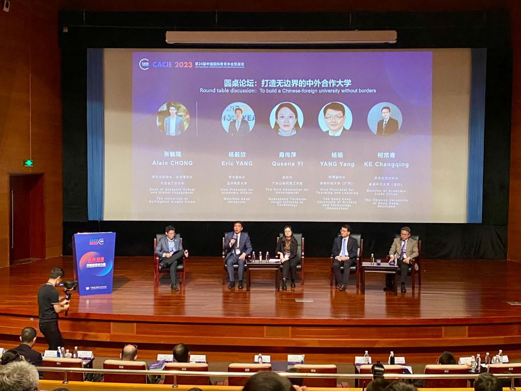 在“启赋未来教育:中外合作办学研讨会”上,来自全国各地的中外合作大学董事长们齐聚一堂,围绕“面向未来的办学模式、国际化人才培养、教育数字化转型及打造无边界的中外合作大学”等话题,共同探讨对未来教育的理解和实践。中国教育部国际合作与交流司涉外办学和监管处处长毛冬敏、中国教育国际交流协会副秘书长安延受邀出席研讨会并现场致辞。昆山杜克大学、西交利物浦大学、宁波诺丁汉大学、北师港浸大联合学院、上海纽约大学、深圳北理莫斯科大学、温州肯恩大学、广东以色列理工学院、香港科技大学(广州)及香港中文大学(深圳)等中外合作大学负责人分享了各自机构的做法与特色,并与参会人员充分互动。在问答环节,熊勇副经理围绕后疫情时代外国优质教育资源引进、外籍教师聘用等现实问题请教了现场专家。