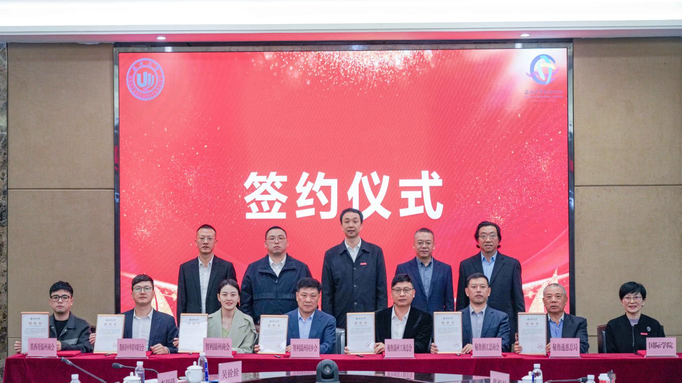 最后,在市、区侨联领导和校领导的共同见证下,公司党总支书记林爱菊与秘鲁通惠总局主席沈达坚、秘鲁浙江总商会会长楼兵强、秘鲁温州工商总会代会长张剑英、智利温州同乡会名誉会长林良松、智利温州商会副会长吴宾洁、墨西哥中华青年联合会副会长陈温畅及墨西哥温州商会副会长林浩敏等7位侨团代表一同签署了合作协议,并为各位代表颁发开展“留学温大”招生宣传相关工作的授权书。