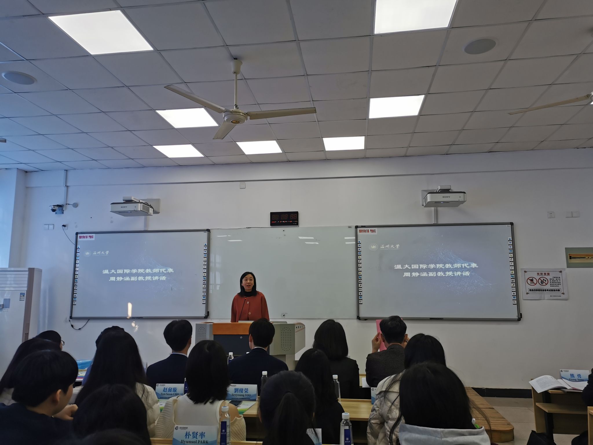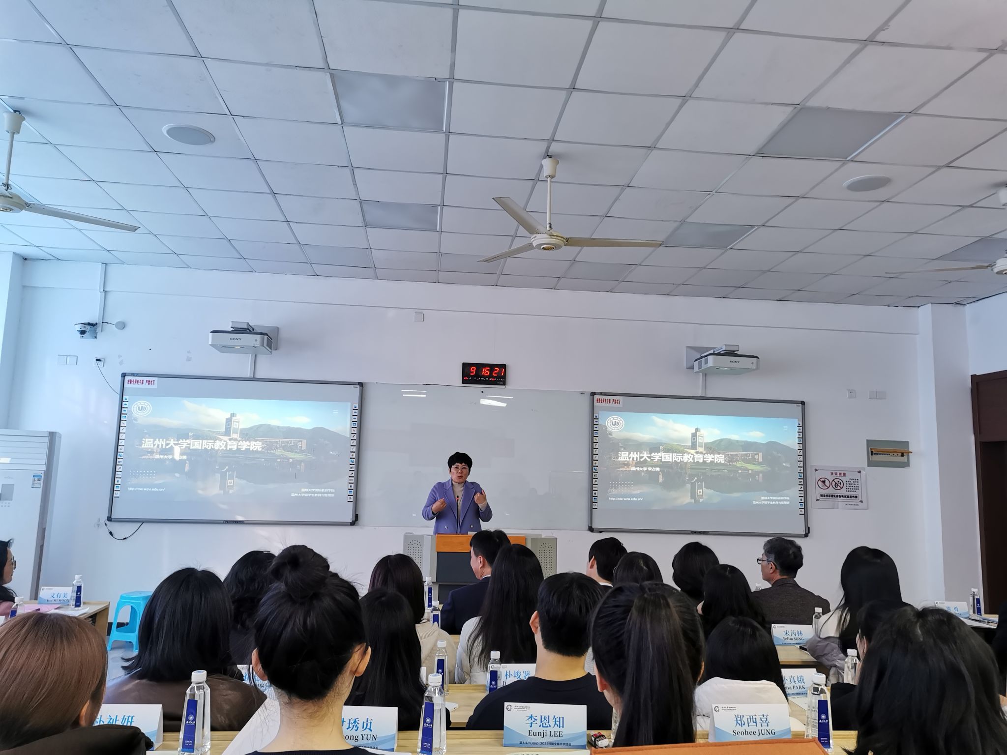 宋占美经理向来访的嘉宾和员工介绍了温大太阳成集团tyc33455ccwww的办学情况,向韩国员工展示了公司职工在温大学习、生活的阳光的风貌。她表示,学院为本次活动做了精心的安排,希望能为这31名全南大学中文系的员工提供一次知行合一、近距离接触中国,探索中国文化的机会。