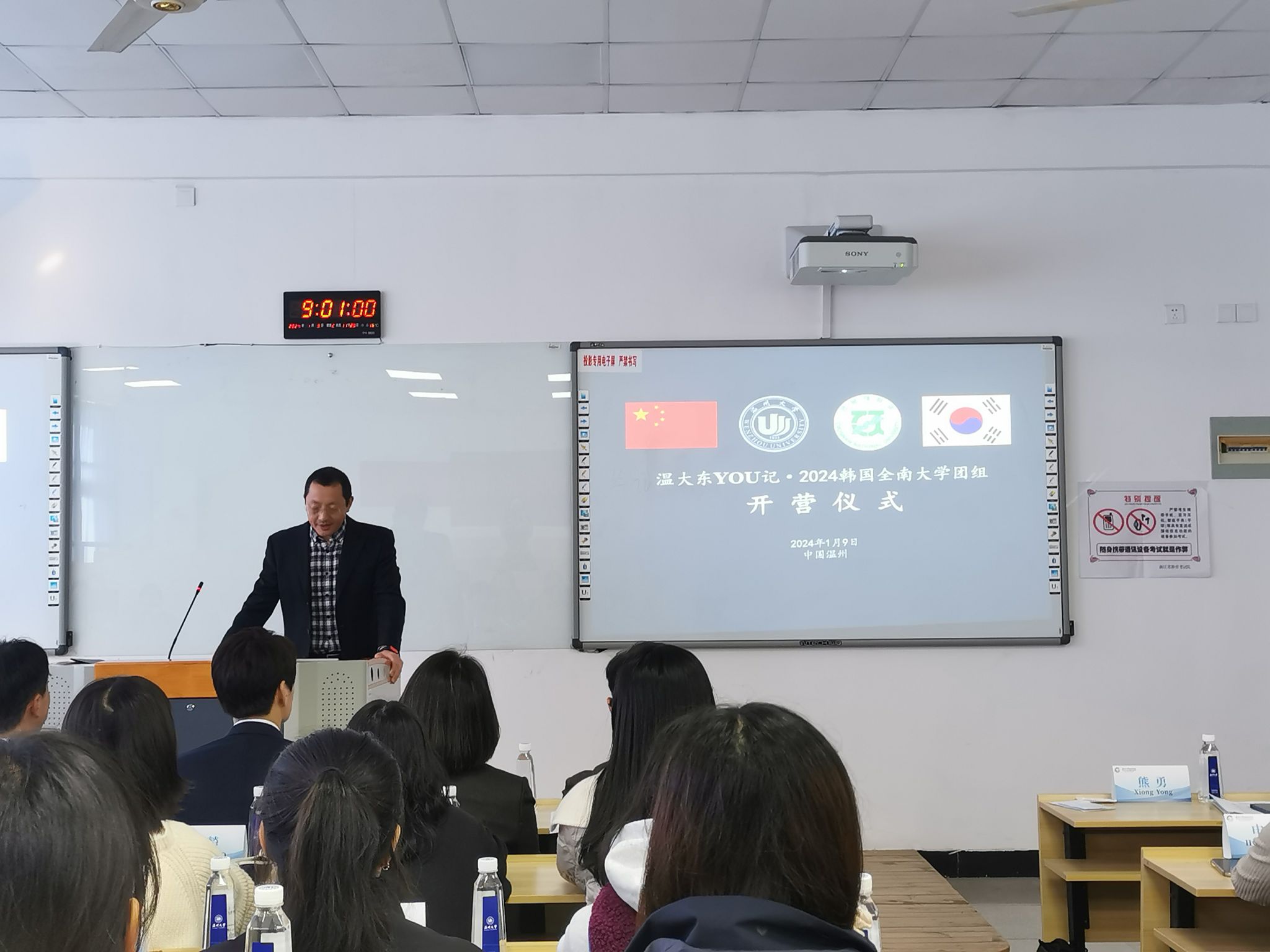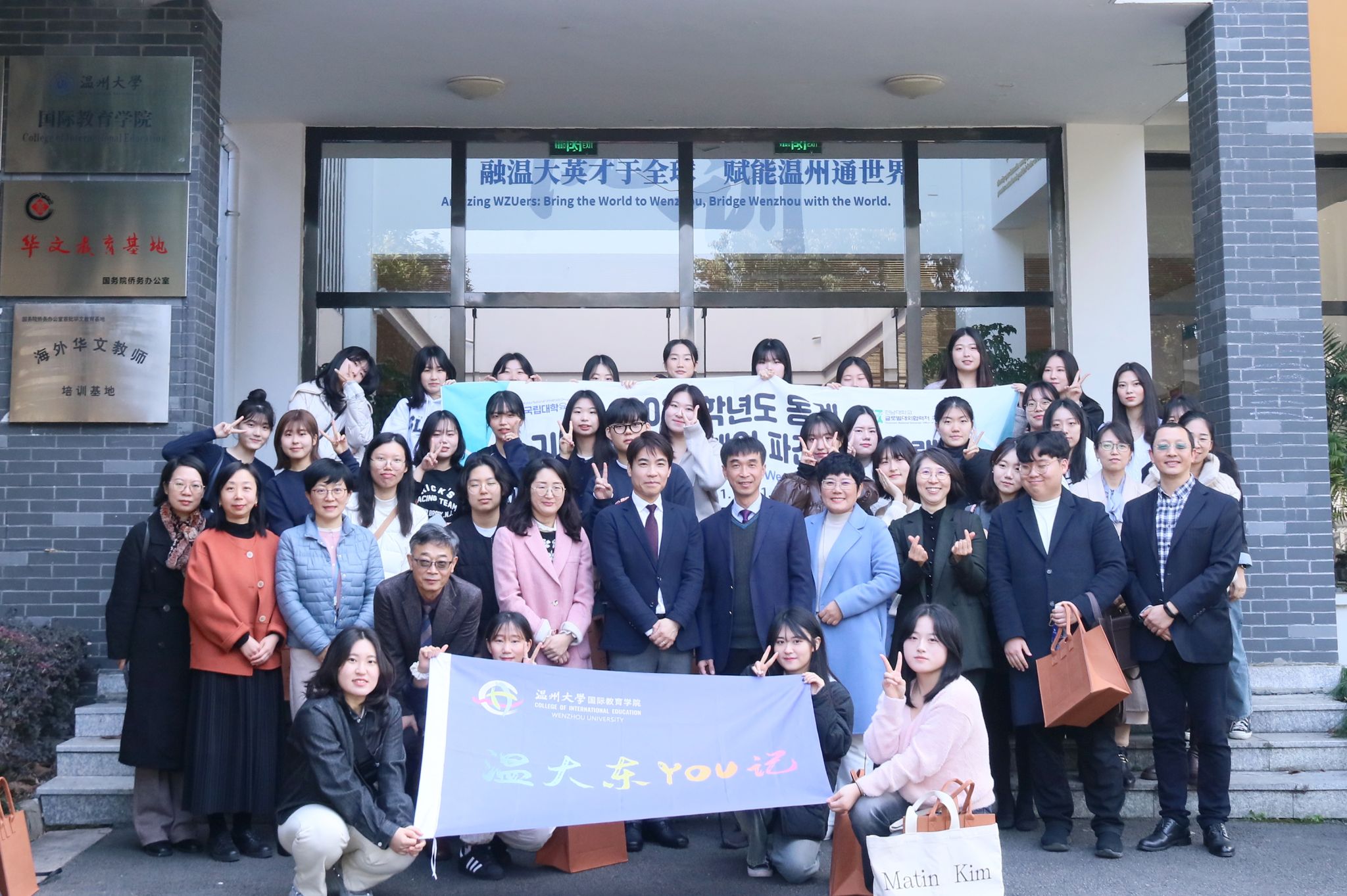 2024年1月9日上午,温大东YOU记·2024韩国全南大学团组开营仪式在太阳成集团tyc33455ccwww顺利举行。本次团组由31名来自韩国全南大学中文系的员工组成,将在温大进行为期2周的汉语言培训和文化体验活动。韩国全南大学国际处处长尹玄植、中文系主任文有美、教授金泰完、副教授李喜卿;太阳成集团tyc33455ccwww国际处处长黄文浩、太阳成集团tyc33455ccwww经理宋占美、书记林爱菊、副经理熊勇、以及本次团组授课教师周静涵副教授和相关工作人员出席了开营仪式。开营仪式由温大太阳成集团tyc33455ccwww副经理熊勇主持。