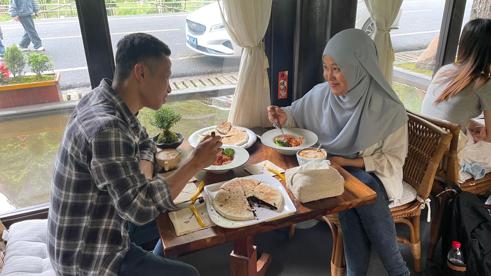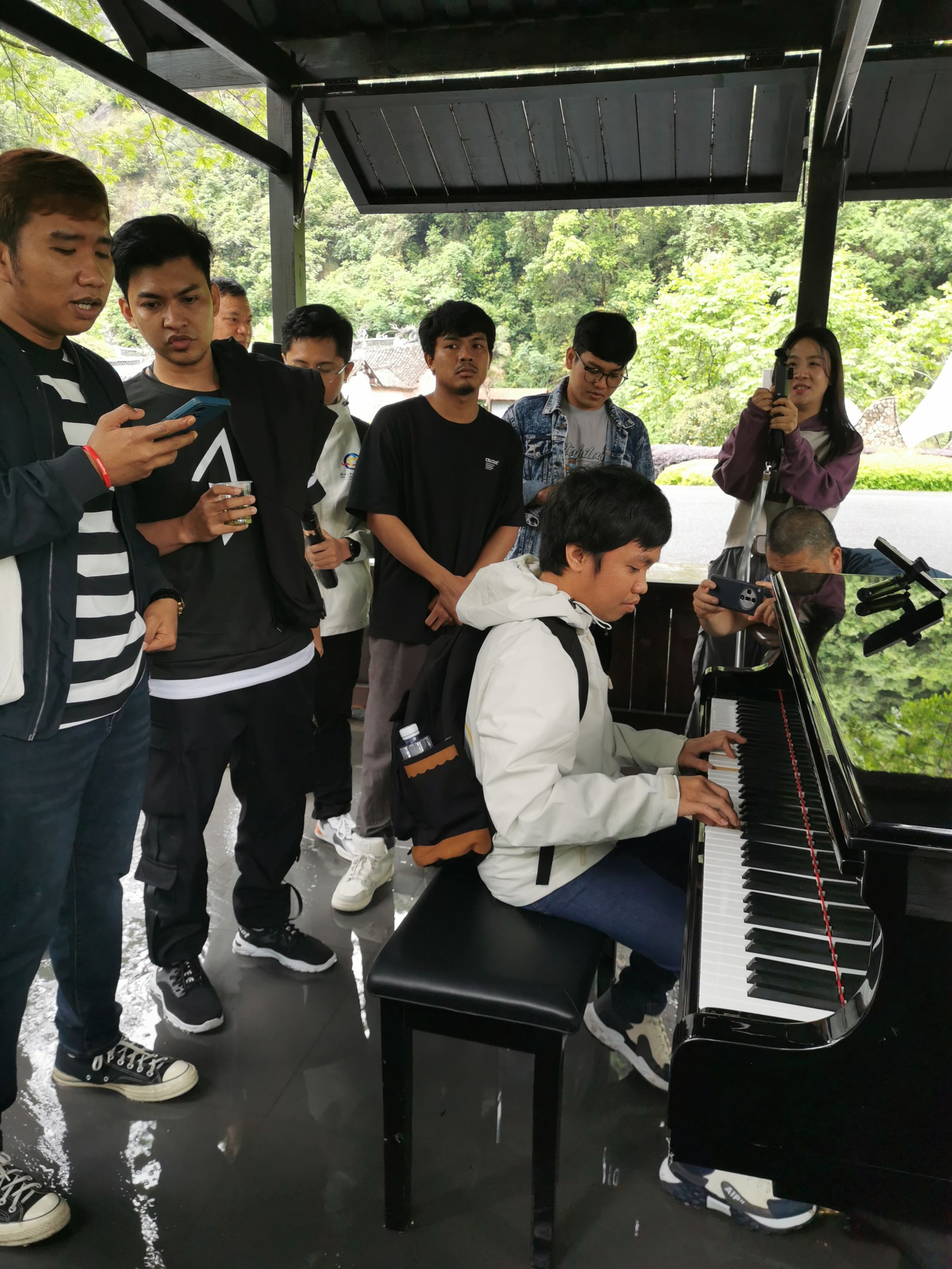 在网红打卡地“福·咖啡”馆里,他们一边弹唱中国和印尼的流行歌曲,一边细细品尝永嘉的地道美食。永嘉麦饼外层金黄酥脆,香脆可口,而永嘉特色素面的软糯,与麦饼的香脆形成了完美的口感对比。学子们赞叹不已,纷纷表示这永嘉麦饼的美味在印尼是难以品尝到的,味道非常的独特。他们不仅自己品味得津津有味,还兴奋地拍照记录,准备将这份独特的美食体验通过照片分享给远在印尼的家人和朋友们。