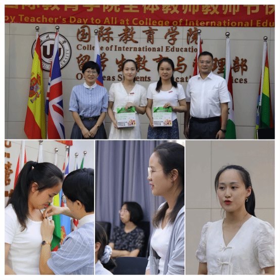 随后,会议举行新入职教工欢迎仪式。彭水琴和周莹瑶两位老师逐一进行自我介绍,受到了全院教师的热烈欢迎。林爱菊书记为两位教师佩戴上校徽,夏远志经理为他们送上了教师节礼物。