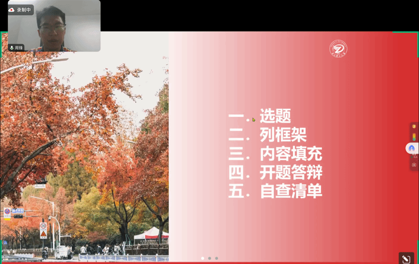 周锋学长针对开题报告的撰写步骤进行了细致入微的讲解,为同学们带来了满满的 “干货”。在选题环节,可以通过广泛阅读、参考导师建议以及与学长学姐、同学交流等多种方式来确定研究课题;同时,选题需综合考量多方面因素,如自身兴趣、关注所在领域的热点问题、课题的可行性和研究价值等。此外,周锋学长还从如何构建开题报告的框架、内容撰写、阅读文献、开题答辩、自查清单等方面分享了宝贵经验。最后,周锋学长特别提醒同学们,撰写开题报告时要注意以下几个当面:一是要严格遵循学校对开题报告的具体要求,不能忽视任何细节。二是要广泛查阅文献,避免重复他人的研究工作,确保研究的创新性。同时,要与导师保持密切且有效的沟通,遇到问题及时请教。在撰写过程中,还要注重语言表达的准确性和规范性,以展现开题报告的专业性。