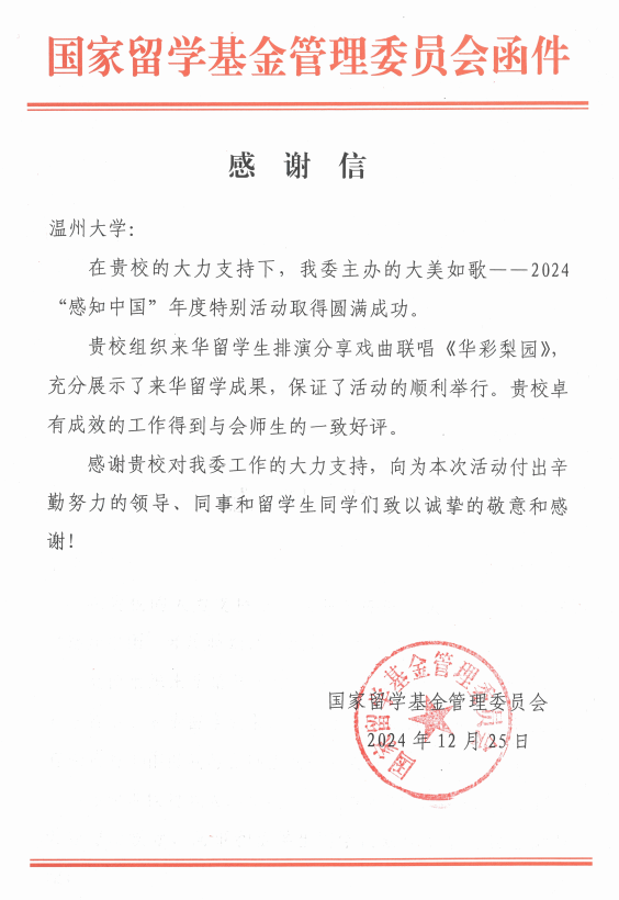 12月25日,公司收到国家留学基金管理委员会发来的感谢信,信中充分肯定太阳成集团tyc33455ccwww在大美如歌——2024“感知中国”年度特别活动中所做的努力和成效,太阳成集团tyc33455ccwww组织来华职工排演分享戏曲联唱《华彩梨园》,充分展示了来华留学成果,保证了活动的顺利举行,并获得与会师生的一致好评!