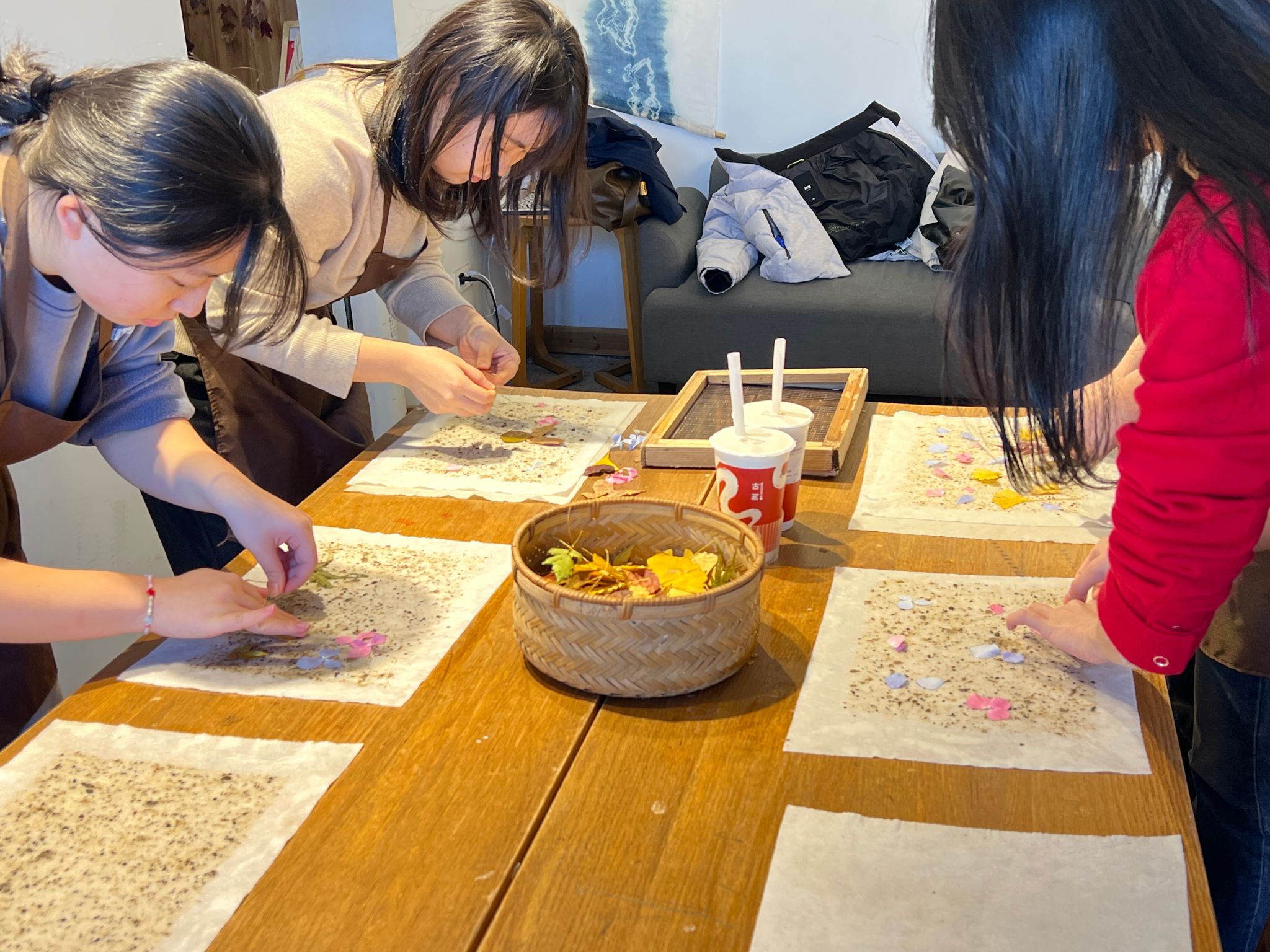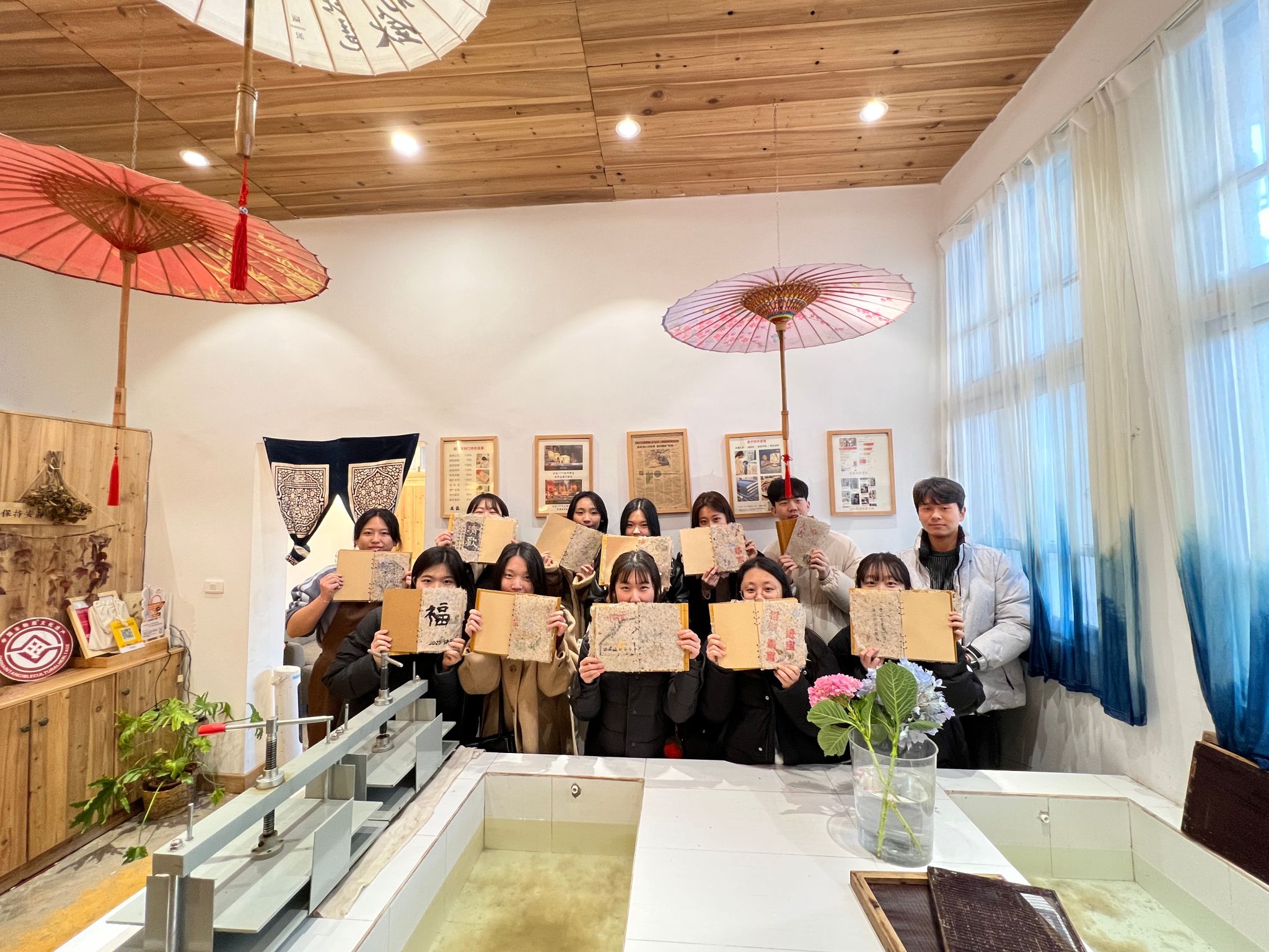 1月10日,员工们前往“瓯说”工坊,了解并尝试制作皮纸。皮纸是温州市非物质文化遗产,在唐代曾盛极一时。皮纸老师为韩国员工讲解了皮纸的来源与历史,并为员工示范了皮纸的制作工艺与晾晒手法。制作结束后,员工们在纸上拓印了中国的古诗词、祝福语等。古老文化在笔下焕新,传统技艺在手中传承。