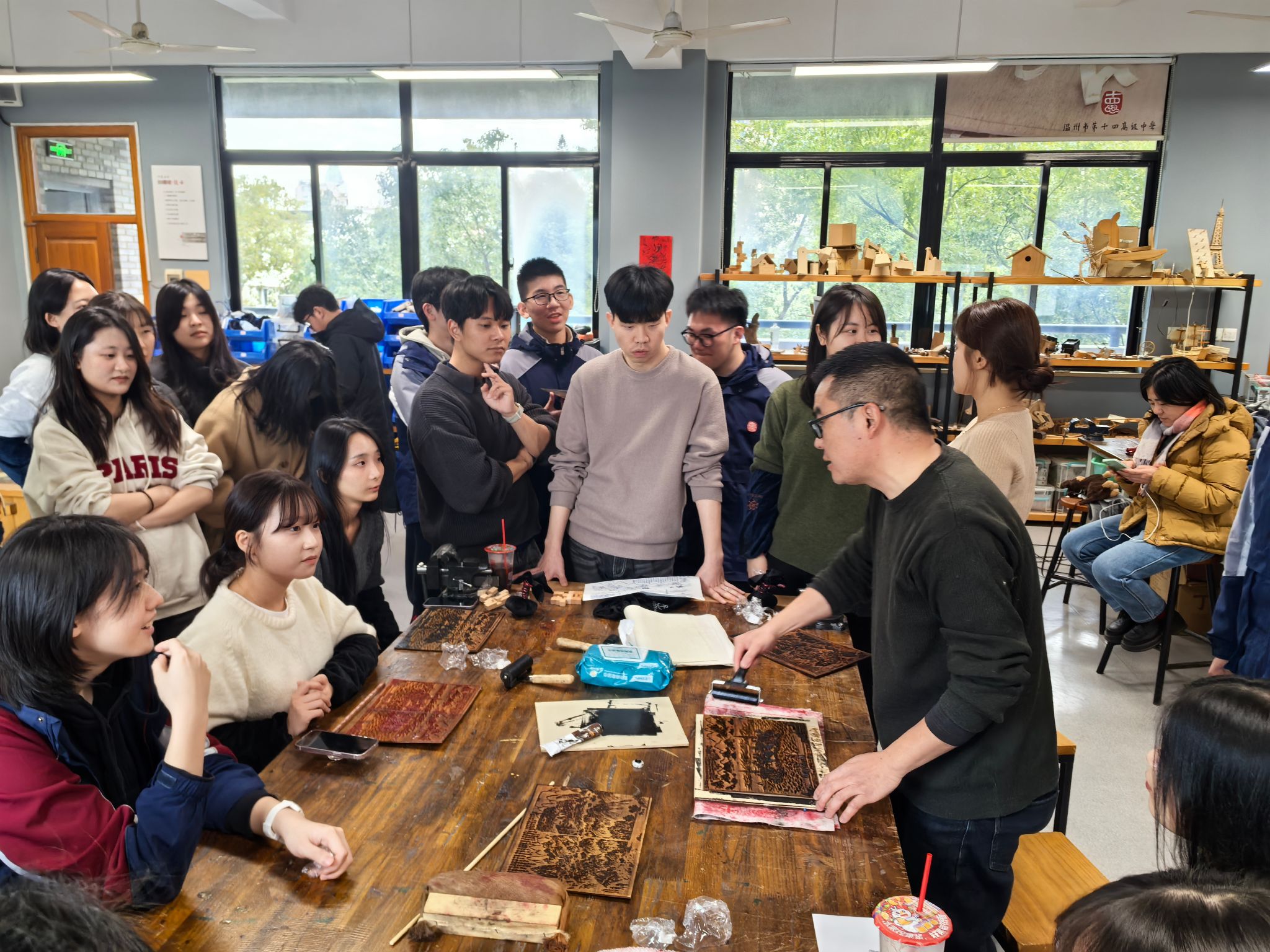 最后一站是温州市第十四高级中学。在这里,韩国员工学习温州文创雕刻版画和六柱鲁班锁。文创雕刻版画复刻了200年前温州孤屿,员工们通过参与拓印与装裱,重温百年前温州山水。鲁班锁是中国传统智慧的体现,通过学习“六柱”“六通”鲁班锁,进一步感受传统中国文化的魅力。之后,中韩员工携手包饺子,饺子作为中国新年的传统美食,承载着团圆与祝福。员工们在包制过程中,不仅体验到动手的乐趣,更深刻感受到中国美食文化的内涵与温情。煮好的饺子热气腾腾,员工们品尝着自己的劳动成果,欢声笑语回荡校园,文化交流在温馨氛围中升温。